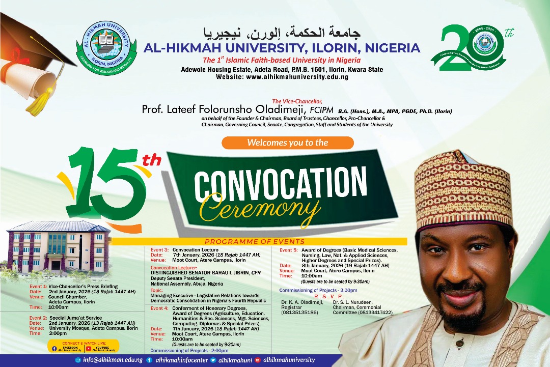 About Al-Hikmah University, Ilorin: It was established in 2005 and commenced academic activities in the 2005/2007 academic year. The Founder of the University is Alhaji Chief (Dr.)AbdulRaheem Oladimeji, OFR, FNAEAP, fSPSP. It is the first Islamic Faith-based University in Nigeria. The University has a non-discriminatory policy in terms of staff recruitment and students enrolment. Availability of...Read More